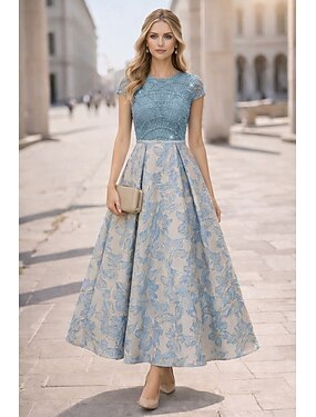 A-Line Abito da Festa Lunghezza Tè Abito Cocktail Abito da Sposa per Invitate Abito Madre della Sposa Manica Corta Girocollo Elegante Lussuoso Formale Cotone Mist con Ricamo