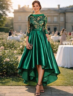 Linea ad A Asimmetrico Vestito da Festa Abito da Cocktail Abito da invitata a nozze Abito da cerimonia per signora Manica 3/4 Collo gioiello Elegante Alto Basso Madre Formale Raso con Pieghe