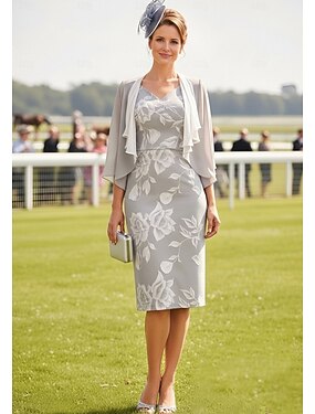 Due Pezzi Tubino Colonna Lunghezza al ginocchio Abito da invitata a nozze Abito da cerimonia per signora Manica Corta Scollo a V Elegante Ospite di nozze Ricevimento di matrimonio Chiffon Pizzo Abiti