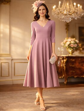 Linea ad A Lunghezza Tè Vestito da Festa Abito da Cocktail Abito da invitata a nozze Abito da cerimonia per signora Mezza Manica Bavero Elegante Minimalista Formale Ospite di nozze Raso con Tinta