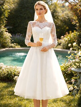 Linea ad A Lunghezza Tè Abiti da sposa Abito da sposa Vintage Anni 1940 / 1950 Piccoli Abiti Bianchi Manica 3/4 Scollo Illusione Laurea Compleanno Pizzo Tulle con Con nastri e fiocchi Applicazioni