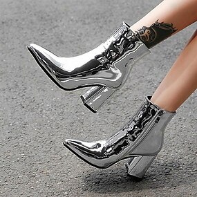 stivaletti da donna in metallo argentato con fodera in pelliccia sintetica, punta affusolata e tacco a blocco, caldi stivaletti alla moda per feste autunnali e invernali e serate fuori