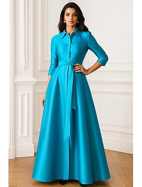 Linea ad A Lunghezza al pavimento Abito Camicia Abito da invitata a nozze Abito Formale Abito da cerimonia per signora Mezza Manica Bavero Elegante Matrimonio Formale Ospite di nozze Raso