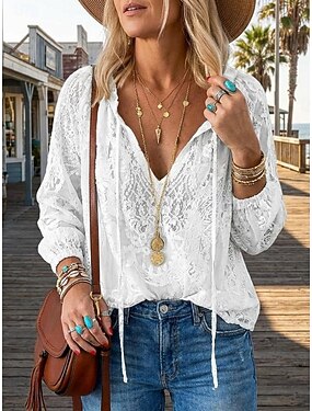 camicetta da donna in pizzo boho con scollo a V, manica lunga, casual, patchwork, tinta unita, bianca, per la primavera estate
