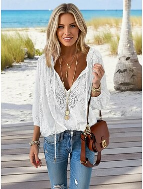 camicetta da donna in pizzo boho con scollo a V, manica lunga, casual, patchwork, tinta unita, bianca, per la primavera estate