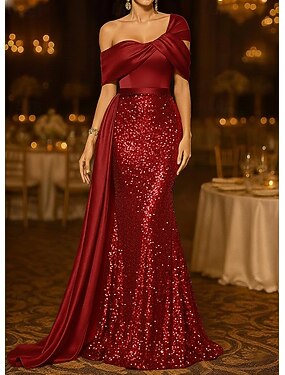 Sirena Tromba Strascico a Terra Lunghezza al pavimento Abiti da Ballo Abito da Sera Da principessa Abito formale Elegante Scintillante Stile Celebrità Manica Lunga Monospalla Festa in giardino