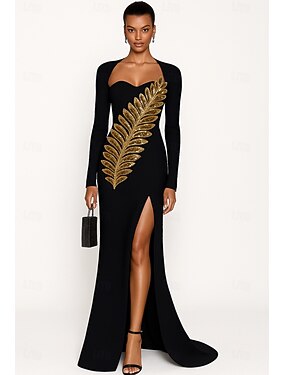Tubino Colonna Abito Lunghezza al pavimento Abito da invitata a nozze Abito Formale Abito da sera Abito da cerimonia per signora Manica Lunga Collo gioiello Elegante Formale Chiffon con Applicazioni