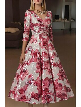 Linea ad A Lunghezza alla caviglia Lunghezza Tè Vestito da Festa Abito da Cocktail Abito da invitata a nozze Abito da cerimonia per signora Manica 3/4 Scollo a V Elegante Vintage Formale Cocktail