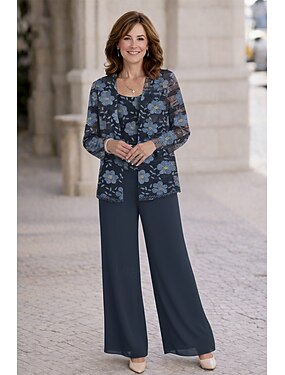 Tre Pezzi Completo Pantalone Lunghezza al pavimento Abito da cerimonia per signora Senza Maniche Manica 3/4 Scollo Tondo Elegante Semplice Abbellito Formale Ospite di nozze Serata Formale Chiffon con