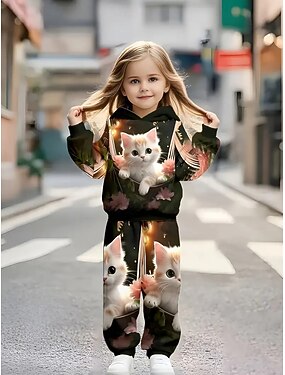 Ragazze 3D Grafico Gatto Set Felpa con cappuccio & Pantaloni della tuta Tuta sportiva Tute da ginnastica Manica Lunga Primavera Autunno Quotidiano Essenziale Casual Bambini Dai 4 anni in su Con
