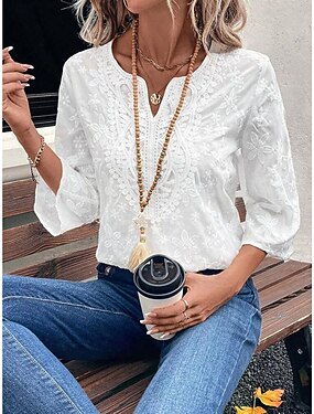 Per donna Camicia Boho Top Eleganti Ricamato Tinta unica Floreale Casual Boho Manica 3/4 Manica al gomito Manica a Campana Scollo a V Top Regolari Quotidiano Uscire Bianco Estate Autunno