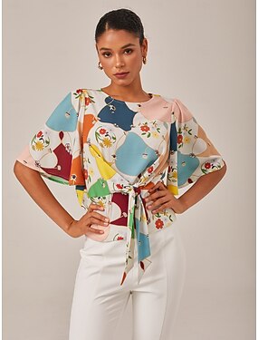 Per donna Femminile Camicia casual Geometrico Floreale Casuale Corte Multi Color Stampato Fascia girovita incrociata Manica Corta Maniche Corte Elegante Bohemien Vacanza A barca Estate Primavera