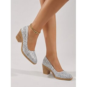 décolleté da donna con tacco a blocco in pizzo argentato - eleganti scarpe chiuse in pizzo floreale con comodo tacco spesso effetto legno per matrimoni, tutti i giorni &occasioni speciali