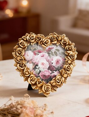 cornice per foto a forma di cuore con rose dorate e floreali, cornice per foto a forma di cuore in resina, cornice decorativa per San Valentino &arredamento per la casa
