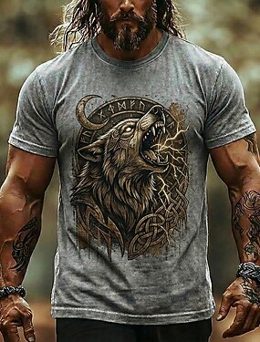 Maglietta da uomo con rune norrene e lupo vichingo, in misto cotone lavato, con grafica, nodo celtico, mitologia, abbigliamento da strada, abbigliamento, taglia S M L XL XXL XXL