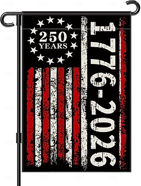 Bandiera da giardino vintage degli Stati Uniti per il 250° anniversario, che celebra i 250 anni (1776-2026) con un design effetto invecchiato rosso, bianco e nero per decorazioni esterne.