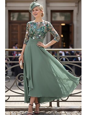 Linea ad A Asimmetrico Lunghezza alla caviglia Perline ricamate Vestito da Festa Abito da Cocktail Abito da cerimonia per signora Manica 3/4 Scollo Illusione Elegante Ospite di nozze Chiffon Pizzo con