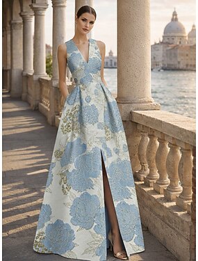Linea ad A Lunghezza al pavimento Abito da Sera Da principessa Elegante Vintage Floreale Senza Maniche Scollo a V Matrimonio Formale Tasca Jacquard con Stampa floreale Pieghe Tasca