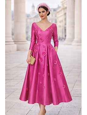 Linea ad A Lunghezza al pavimento Lunghezza Tè Abiti da Cocktail Elegante Vintage Floreale Mezza Manica Scollo a V Festa in giardino Matrimonio Tasca Raso Organza con Fiore ricamato Fiocco/Fiocchi