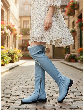 stivali sopra il ginocchio in denim azzurro chiaro da donna – stivali alti fino alla coscia in jeans strappati e rovinati con cerniera laterale per abbigliamento casual da strada e concerti
