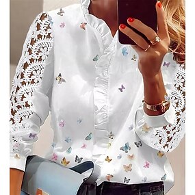 Per donna Camicia di Pizzo Maglietta Blusa Top traforato Pizzo Farfalla Moderno Scollo a V Quotidiano Bianco Primavera & Autunno Autunno & Inverno