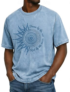 T-shirt da uomo "dream by the sun rest by the moon" con mandala sole e luna, stile boho celeste, lavaggio acido, stile streetwear vintage, grafica, manica corta, girocollo, casual, abbigliamento