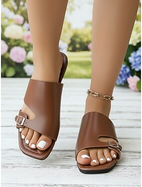 Sandali bassi da donna marroni con cinturino a fibbia a due vie in punta - comodi sandali casual per viaggiare e per l'uso quotidiano