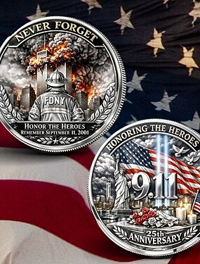 Moneta commemorativa statunitense dell'11 settembre, in onore dei vigili del fuoco di New York. &eroi, bandiera patriottica &Moneta commemorativa per il 25° anniversario, in ricordo dell'11 settembre