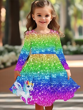 ragazze' 3D Arcobaleno Unicorno Abito Manica Lunga Estate Primavera Vacanza Quotidiano Ferie Principessa Bello Dolce Bambini 4-12 Anni Vestito Casual Abito a trapezio Lunghezza al ginocchio