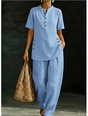 Per donna Set di biancheria in cotone Set di Pantaloni Manica Corta Dolcevita Tinta unica Elegante Moda Streetwear Casuale Quotidiano All'aperto Blu Vino Cachi Primavera & Estate Vestibilità comoda