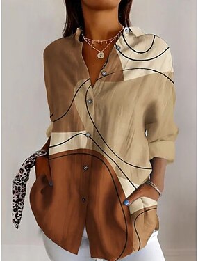 Camicia da donna in lino simile traspirante leggera grafica geometrica vintage quotidiana casual maniche lunghe colletto abituali per uso quotidiano vacanze stampa verde salvia gialla marrone khaki