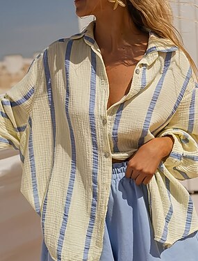 Per donna Camicia Estiva Camicia casual Blusa Arricciato Bottoni Plaid A righe Elegante Casual Spiaggia Manica Lunga Collo ripiegato Top Regolari Quotidiano Ferie Abbigliamento da vacanza Giallo