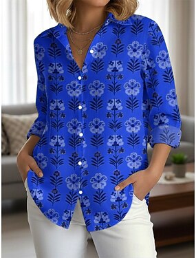 Per donna Camicia Top Eleganti Ricamato Bottoni Floreale Grafico Semplice Elegante Signore Classico Manica Lunga Colletto a Camicia Top Regolari Quotidiano Lavoro Ferie Blu Estate Primavera