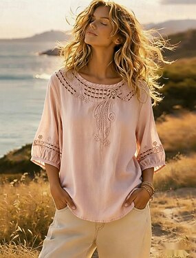 Per donna Camicia Blusa Finto cotone e lino Ricamato Floreale Attivo Vintage Elegante Manica Lunga Girocollo Top Regolari Quotidiano Ferie Uscire Giallo Rosa Blu marino Verde Estate Primavera