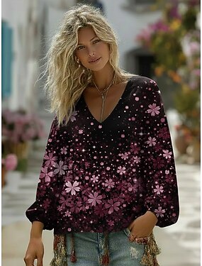 Per donna Camicia Tunica Stampato Grafico Geometrico Bohemien Vintage Quotidiano Manica Lunga Scollo a V Top Regolari Quotidiano Ferie Rosa Estate Primavera