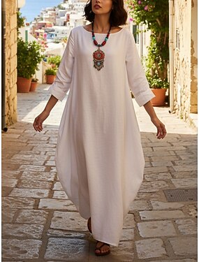 Per donna Abito maxi Finto cotone e lino Abito Boho Vestito a caftano Vestito Casual Elegante Moda Moderno All'aperto Vacanza Uscire Vestibilità comoda Semplice Manica Lunga Girocollo Blu Nero Bianco