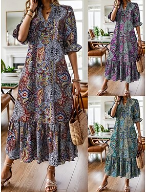 Per donna Abito Midi Abito Floreale Abito Stampato Moda Moderno All'aperto Vacanza Uscire Vestibilità comoda Floreale Mezza Manica Scollo a V Verde acqua Rosso Viola Estate Primavera
