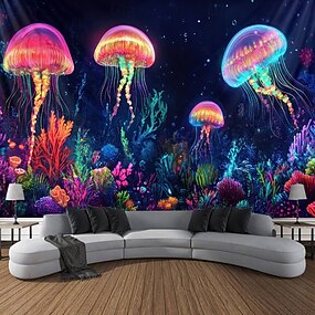 Arazzo Blacklight Luminoso al Buio Festa Luminescente Reattivo UV Meduse Oceaniche Paesaggio Naturale Nebuloso Appeso Arazzo Arte Murale per Soggiorno Camera da Letto