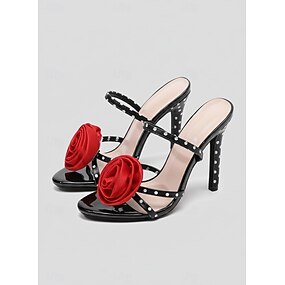 sandali da donna con tacco a spillo a pois e decorazioni a forma di rosa rossa, tacchi alti con cinturino e punta aperta per cocktail party, vita notturna e appuntamenti serali