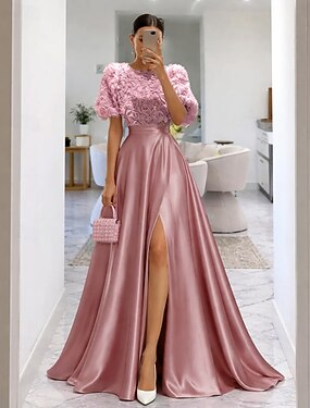 Linea ad A Lunghezza al pavimento Abito da Sera Elegante Abbellito Semi-formale / Cocktail Manica Corta Girocollo Festa serale Matrimonio Raso Pizzo con Fiori 3D Spacco