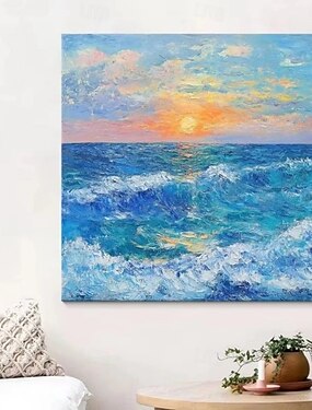 dipinto a olio originale fatto a mano con texture spessa e colorata, paesaggio marino su tela, astratto tramonto oceano arte murale per arredamento casa con cornice tesa senza cornice interna