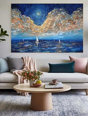 dipinto a olio 3D fatto a mano di paesaggio costiero, scena di barca a vela con tavolozza di colori vivaci e pennellate impastate, pezzo unico per l'arredamento della casa, tela arrotolata moderna