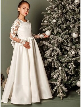 Linea ad A Lunghezza al pavimento Abito da damigella d'onore bambina Prima comunione Ragazze Abito da ballo carino Raso con Fiocco/Fiocchi Elegante Misura 3-16 anni