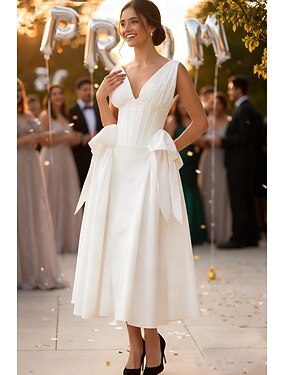 Linea ad A Lunghezza Tè Abito da laurea Abito da Ballo Vestito da Festa Abiti da sposa Abito da sposa Elegante Vintage Piccoli Abiti Bianchi Senza Maniche Scollo a V Formale Compleanno Raso con
