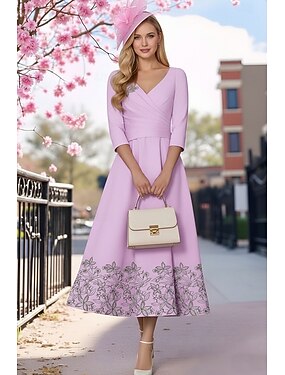 Linea ad A Abito Lunghezza Tè Perline ricamate Vestito da Festa Abito da Cocktail Abito da cerimonia per signora Manica 3/4 Scollo a V Elegante Semplice Formale Raso con Pizzo Arricciato Paillettes