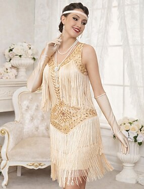 Set Anni Ruggenti Anni 1920 Lunghezza al ginocchio Vestito Nozze Addio al celibato con accessori Senza maniche Il grande Gatsby Charleston Paillettes Frangia con nappe Piuma Scollo a V Costume Per