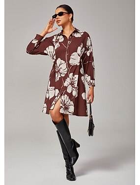 abito midi da donna, camicia in rayon con stampa floreale marrone, manica raglan, elastico in vita regolabile, vestibilità comoda, casual, quotidiano, primavera estate autunno
