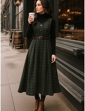 Per donna Abito Midi Tubino Abito a trapezio Vacanza Casual Boho Quotidiano Ferie Plaid Manica Lunga Dolcevita Verde scuro blu navy Marrone