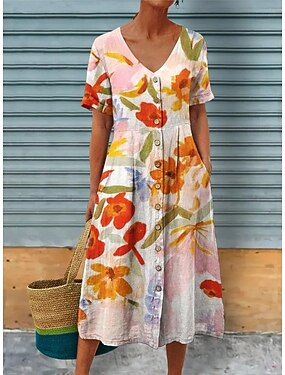 Per donna Abito Midi Abito a Tubino Vacanza Casual Boho Vestibilità regolare Floreale Grafico Manica Corta Scollo a V Fucsia Arancione Estate Primavera