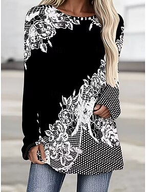 Per donna Maglietta Stampato Floreale Grafico A Pois Vintage Elegante Classico Manica Lunga Girocollo Top Regolari Quotidiano Bianco / Nero Nero Bianco Primavera Autunno